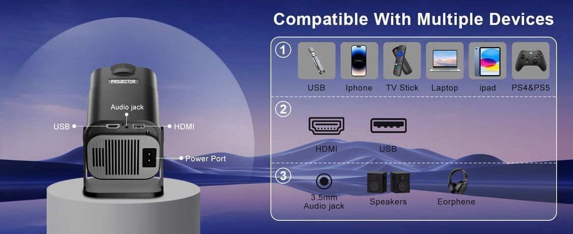 配備HDMI、3.5 毫米音訊和 USB 連接埠;HDMI可連接到電腦、遊戲機、機上盒等,USB 連接埠可連接到電視棒、手機、平板電腦、USB 驅動器等。