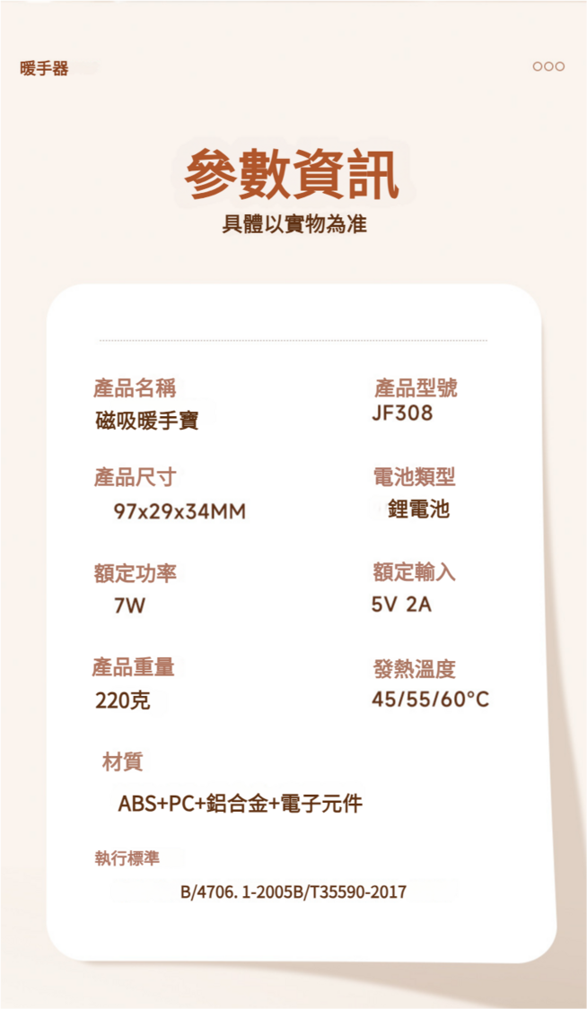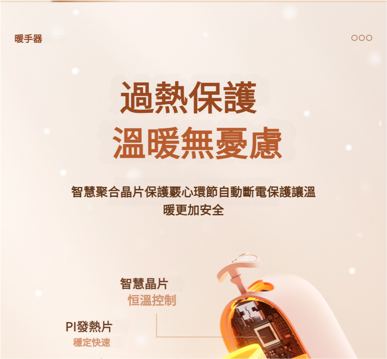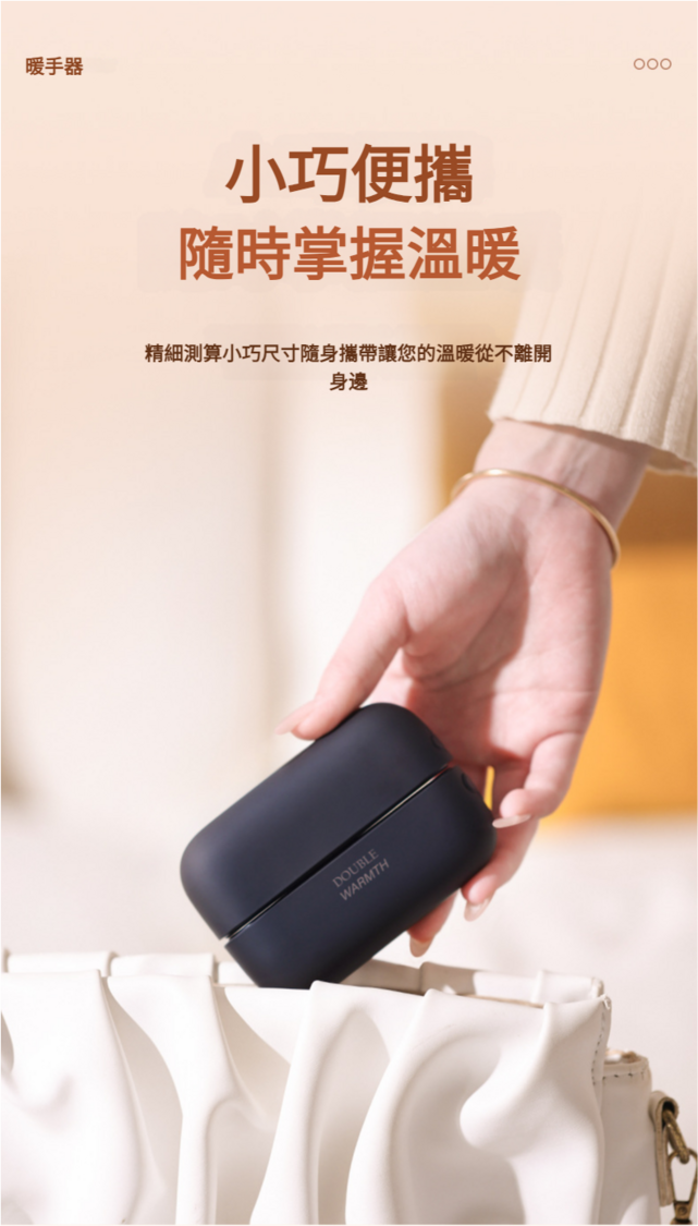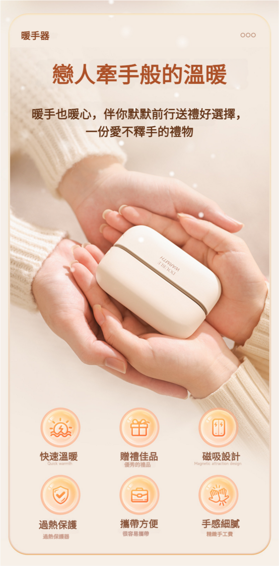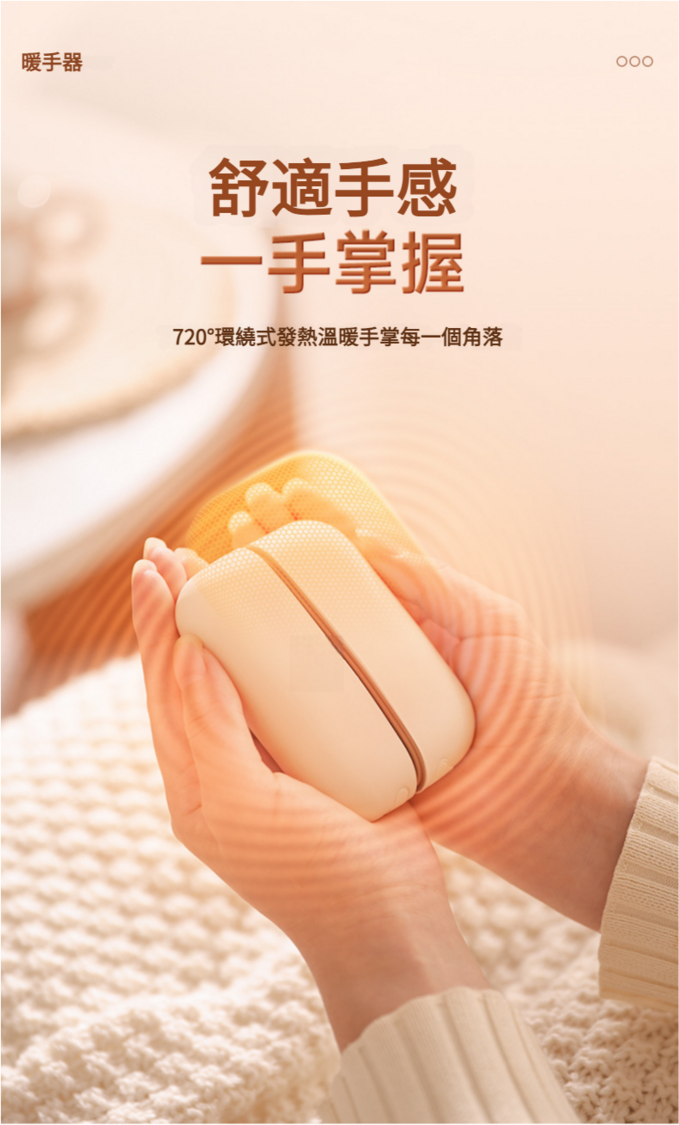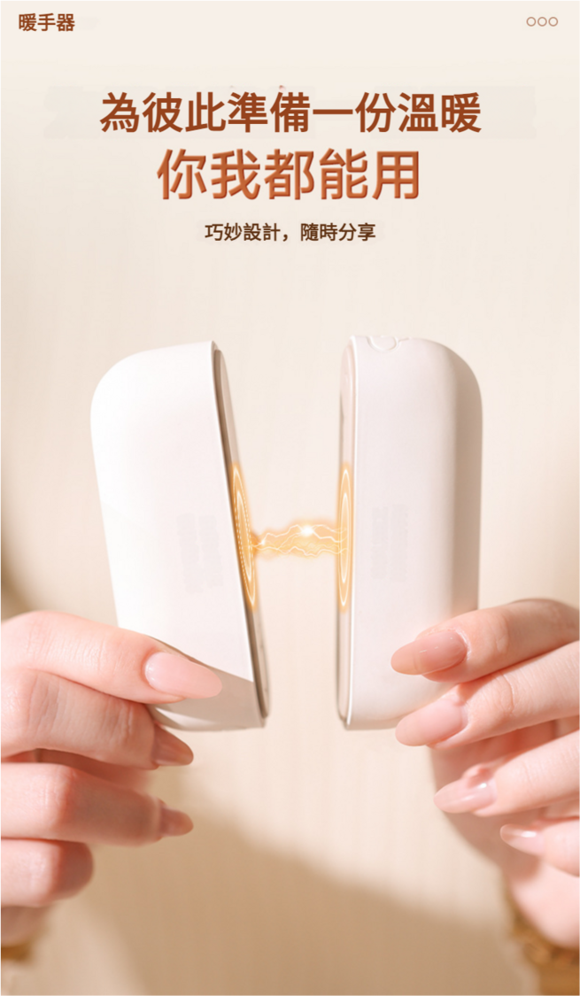 1.點選看電量.2.長按三秒開啟暖手寶(預設1檔45°),點選開啟2檔55°再點選開啟3檔60°,以此循環。長按三秒關機。