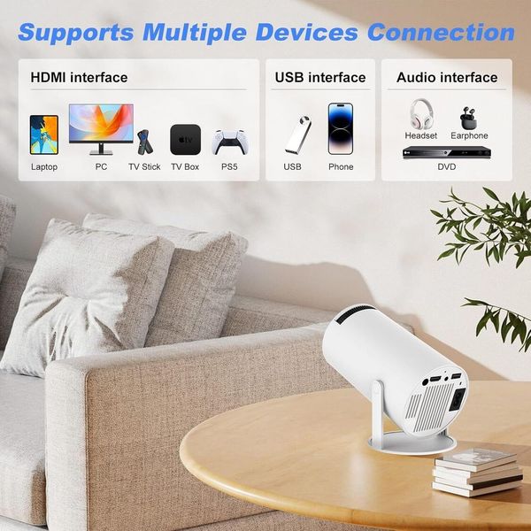 HY300迷你投影機配備充電線和180°旋轉,方便攜帶,可用於多種用途。 (您只需將其放入背包或旅行箱中),例如 露營、旅行或戶外聚會時。 10.08 x 10.35 公分的迷你尺寸和 500 克的淨重,非常適合攜帶。