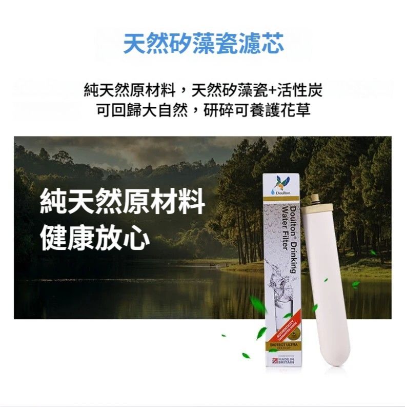 過濾精度:採用 0.2 微米天然矽藻瓷濾芯,可攔截細菌(如大腸桿菌)、懸浮顆粒、膠體等污染物,同時保留水中的鈣、鎂等有益礦物質。
