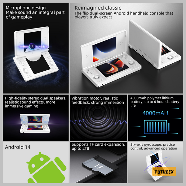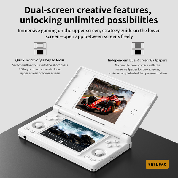 ✅ **雙屏遊戲新體驗**:真正重現經典雙屏遊戲體驗。上層4吋IPS屏幕用於沉浸式遊戲,下層屏幕可顯示攻略、地圖或作為觸控控制器。一鍵快速切換上下屏幕嘅手掣操控焦點。