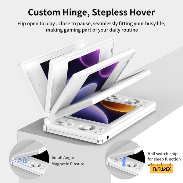 ✅ **智能設計同續航**:自訂轉軸可無段式調節角度。內置霍爾磁吸開關,閂蓋自動進入休眠模式,慳電又方便。4000mAh聚合物鋰電池提供長達6小時連續遊戲時間。