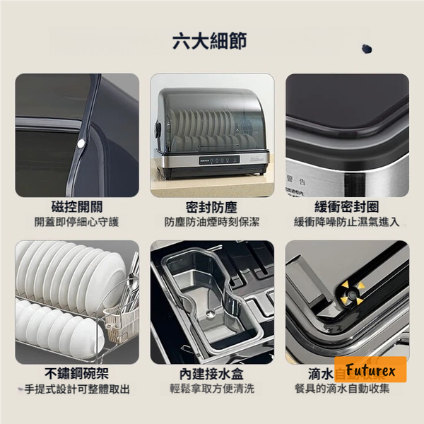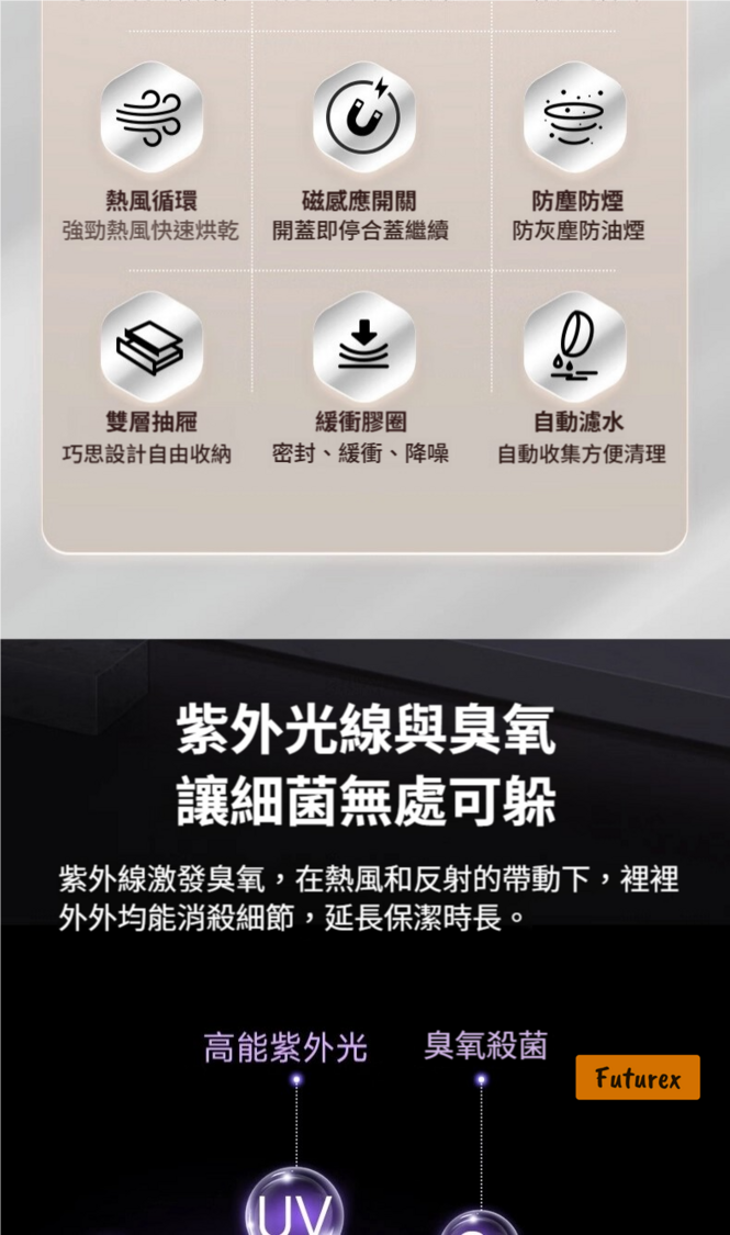 • 99.99%殺菌率,紫外線+臭氧雙重消毒