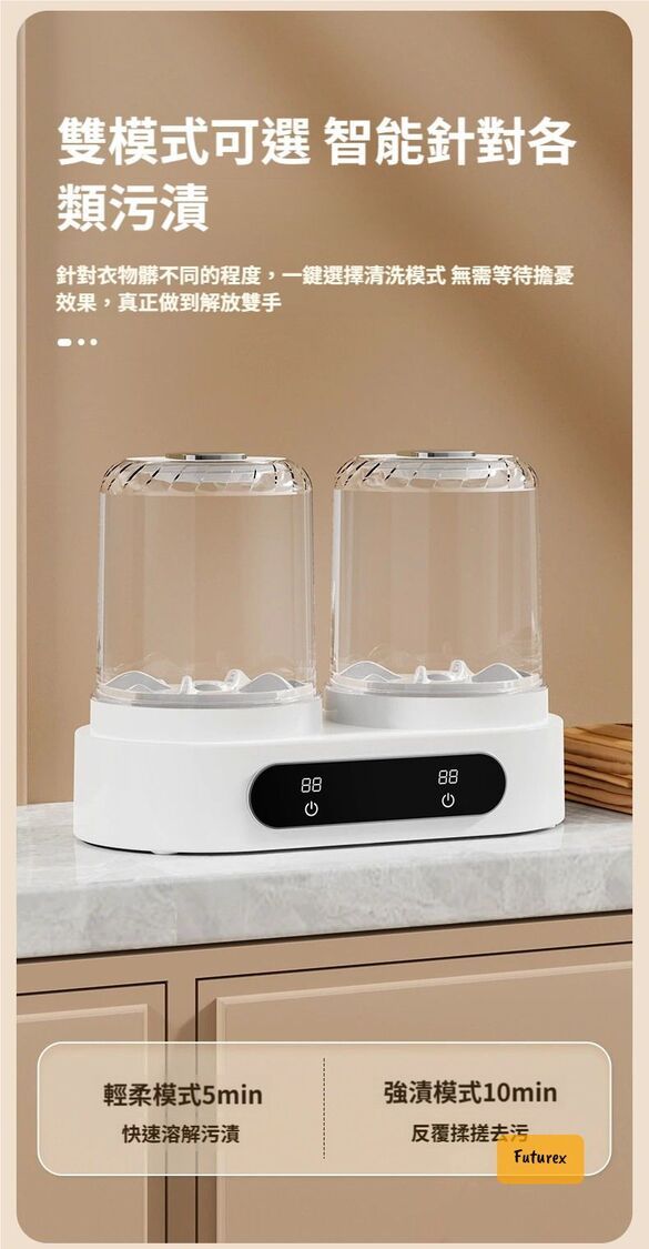 - 雙模式選擇:輕柔模式(5分鐘)日常清洗,強漬模式(10分鐘)頑固污漬