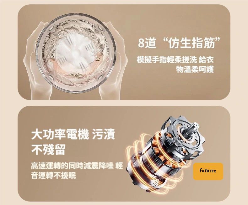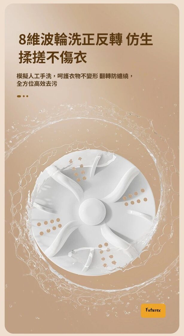 - 8維波輪仿生搓洗,模擬人手溫柔洗滌,保護衣物不變形