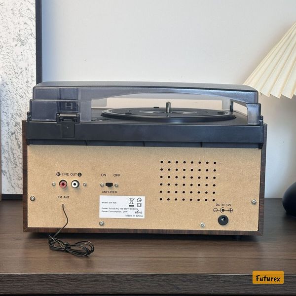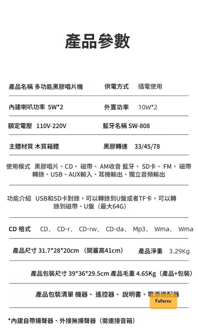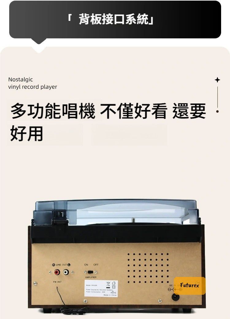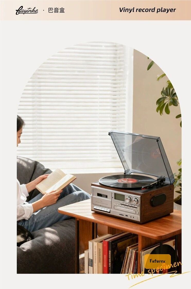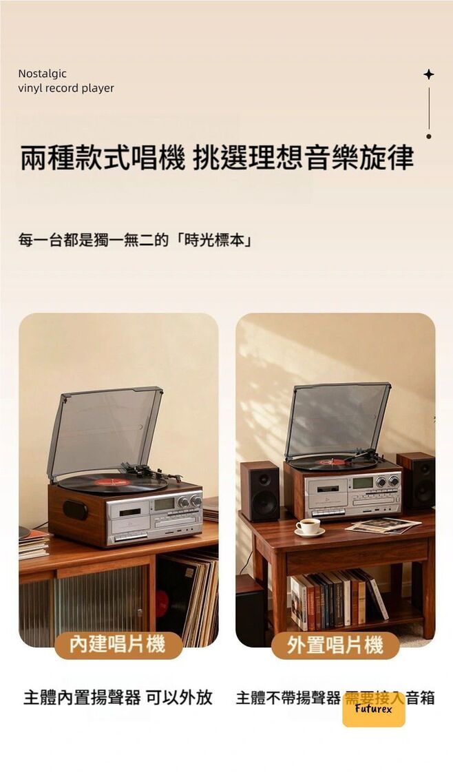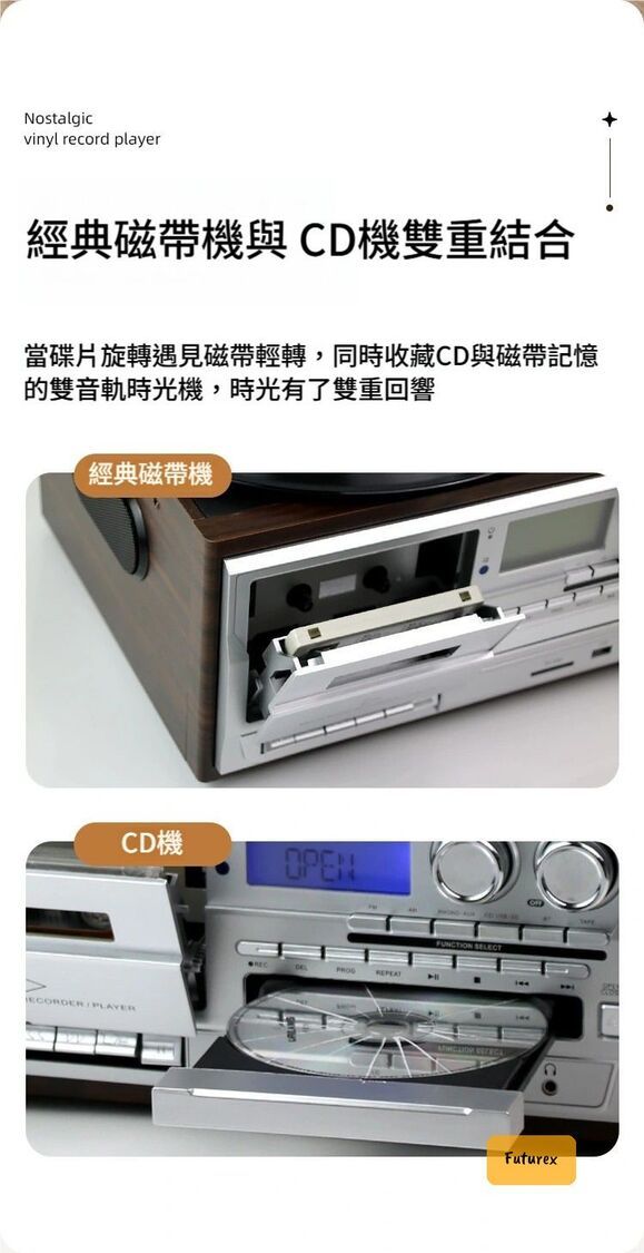 - 7合1多功能音響系統:支援黑膠唱片、CD、磁帶、藍牙5.0、SD卡、USB、FM/AM收音