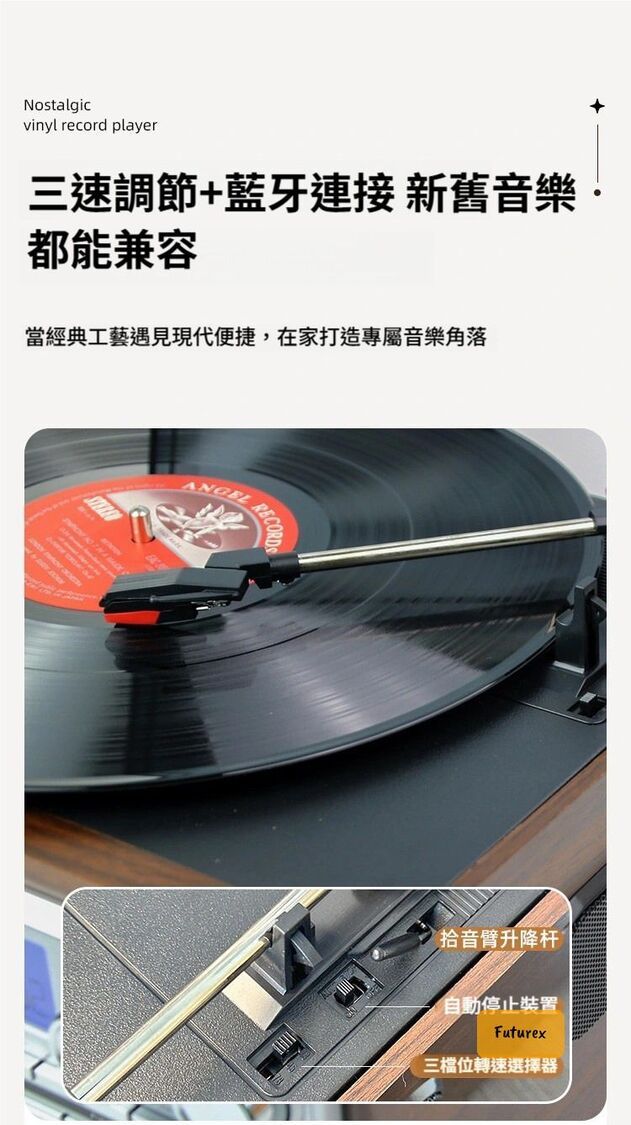 - 三速黑膠轉盤(33/45/78轉),兼容7、10、12英吋唱片