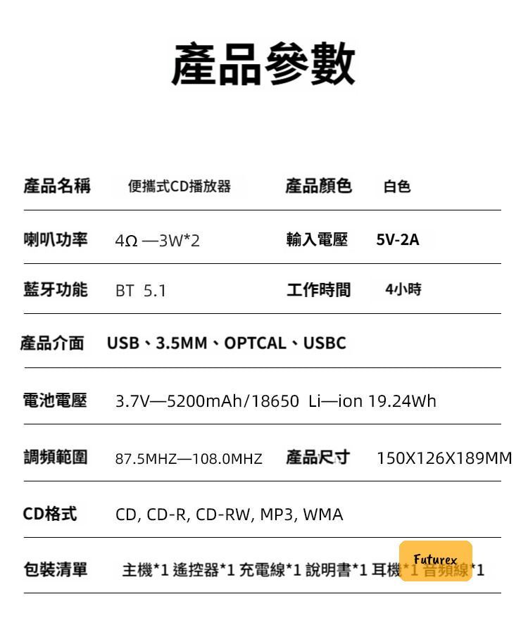 - 支援CD格式:CD、CD-R、CD-RW、MP3、WMA