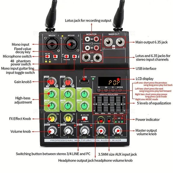 高低音與增益調節,音色增益調節,5段均衡調節,殘響調節,即時耳返監聽
