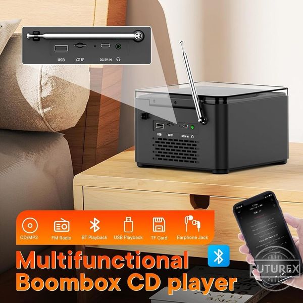 同其他一般嘅 cd 播放器唔同,呢個唔單止係一個便攜式 cd 播放器,仲係一個便攜式藍牙喇叭,呢個無線藍牙 CD 播放器便攜式音箱配備藍牙5.1技術,提供強大、平衡嘅聲音同最小嘅失真,為你帶嚟無與倫比嘅音質。