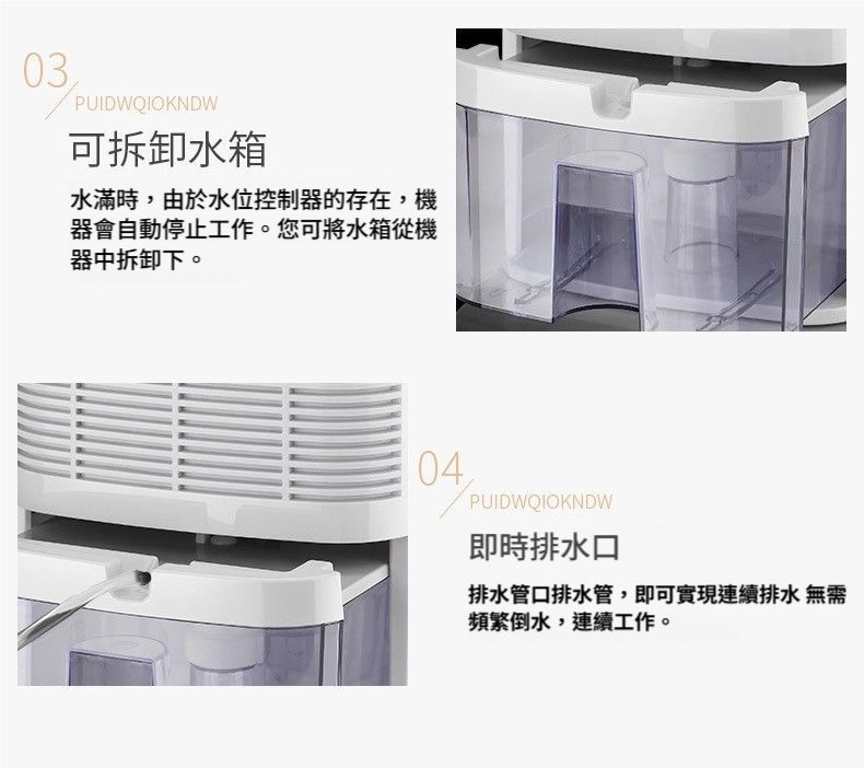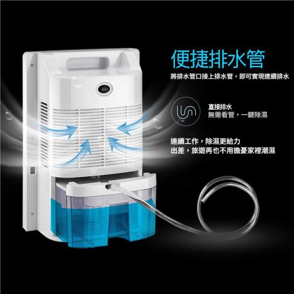 雙排水系統,靈活應對: 內建2.2L大容量水箱,當水箱水滿時會自動停機,並亮起紅燈提醒您倒水。若您需要長時間連續除濕,可使用便攜排水管,將其接入排水口,實現不間斷排水。