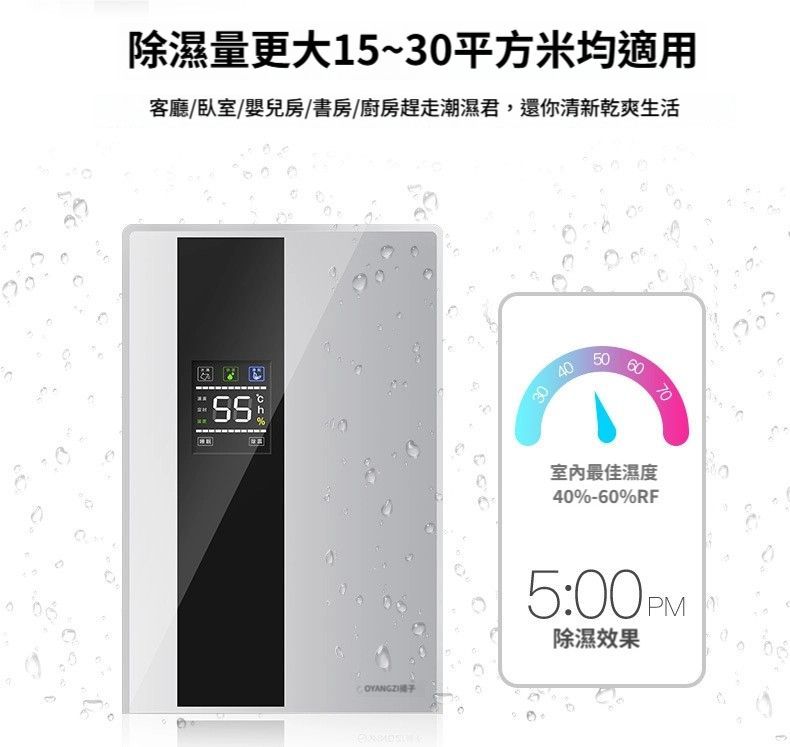 智慧恆濕設定,精準掌控濕度:您可以自由設定理想的濕度值,當室內濕度達到設定值時,除濕機將自動停機。而當濕度值高於設定值5%時,機器又會自動啟動工作,始終為您保持穩定又舒適的室內濕度環境。