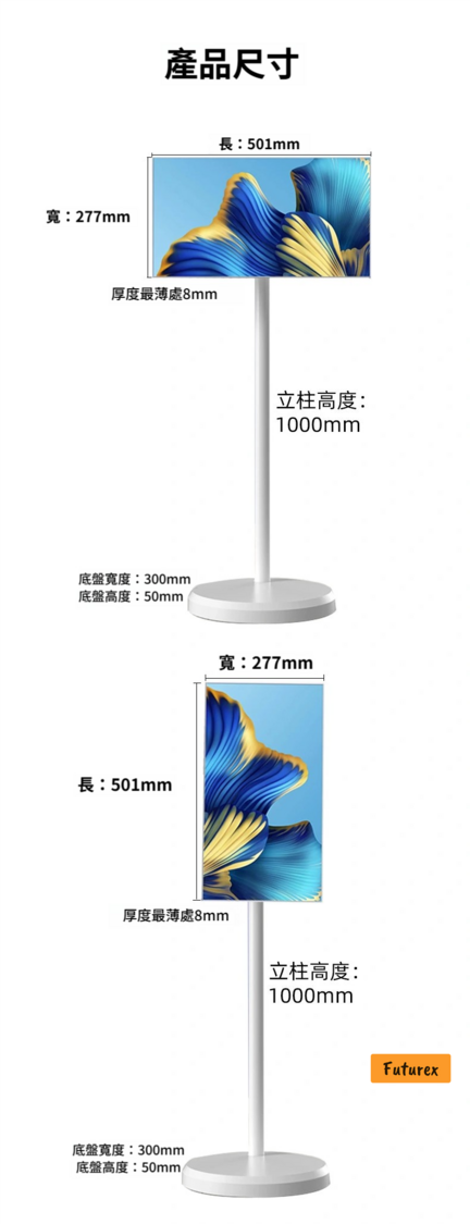 - 尺寸:長501mm、闊277mm、最薄8mm、立柱高1000mm、底盤闊300mm、底盤高50mm