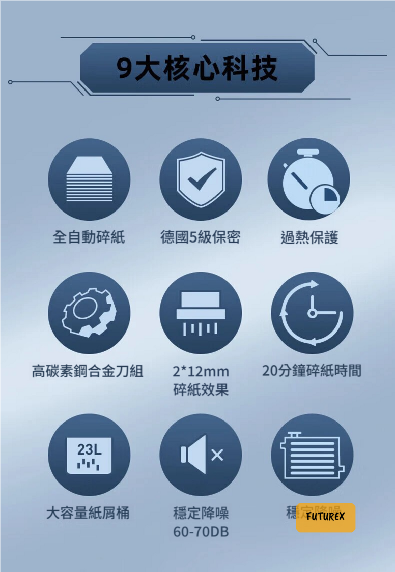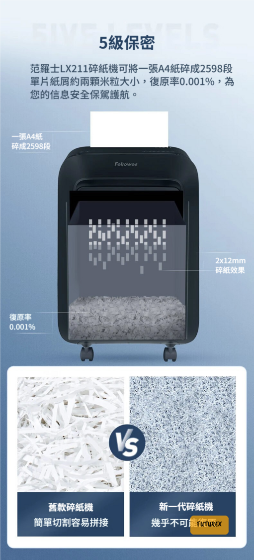 - 德國DIN66399五級保密:將A4紙碎成2598段,2x12mm顆粒大小,復原率僅0.001%