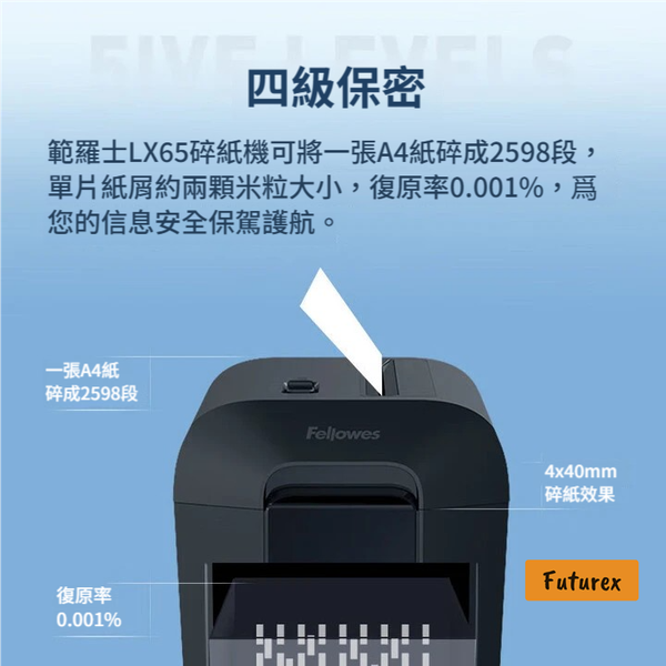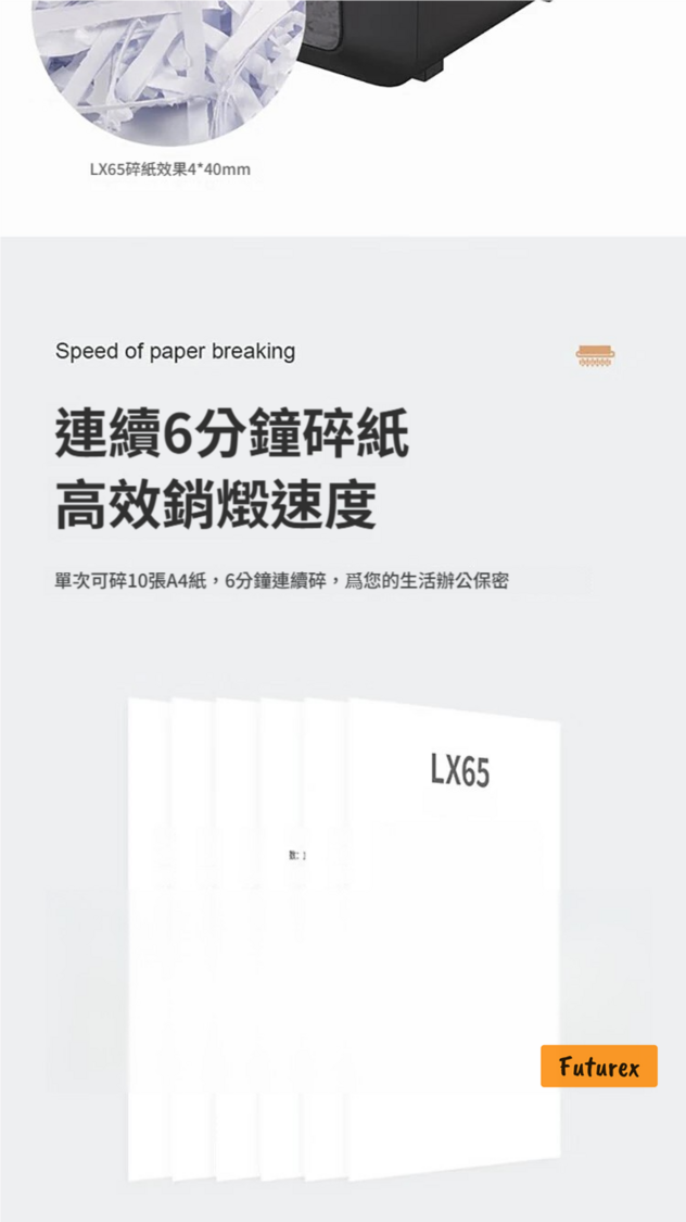 - 4級保密碎紙:將A4紙碎成2598段4x40mm紙屑,復原率僅0.001%,保密效果一流