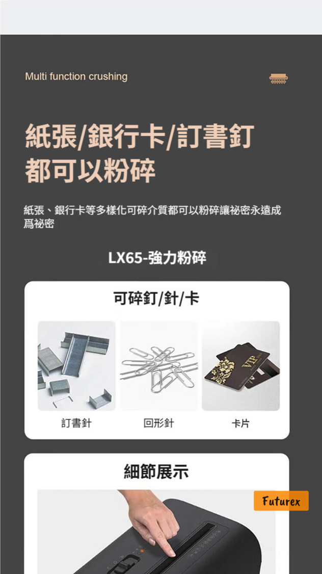 - 多功能粉碎:紙張、銀行卡、訂書釘、回形針統統搞得掂,唔使分開處理
