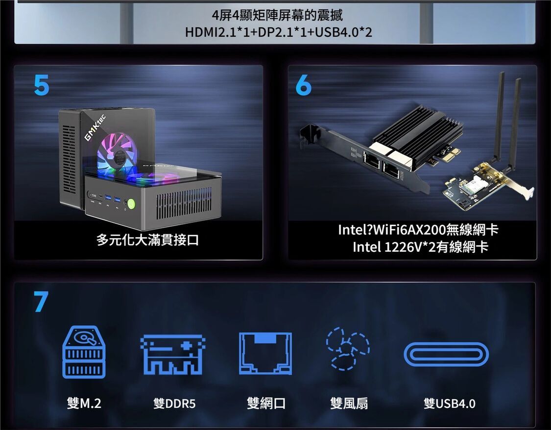 網路:WiFi 6 (AX200,最高 2.4Gbps)、藍牙 5.2、雙 2.5G LAN (Intel I226V*2)