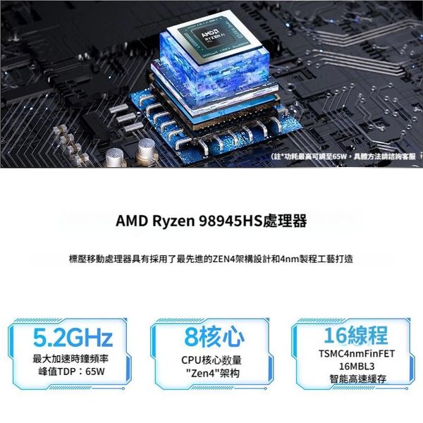 CPU:AMD Ryzen™ 9 8945HS,8 核心 16 線程,4.0GHz 基本頻率,5.2GHz 最大頻率