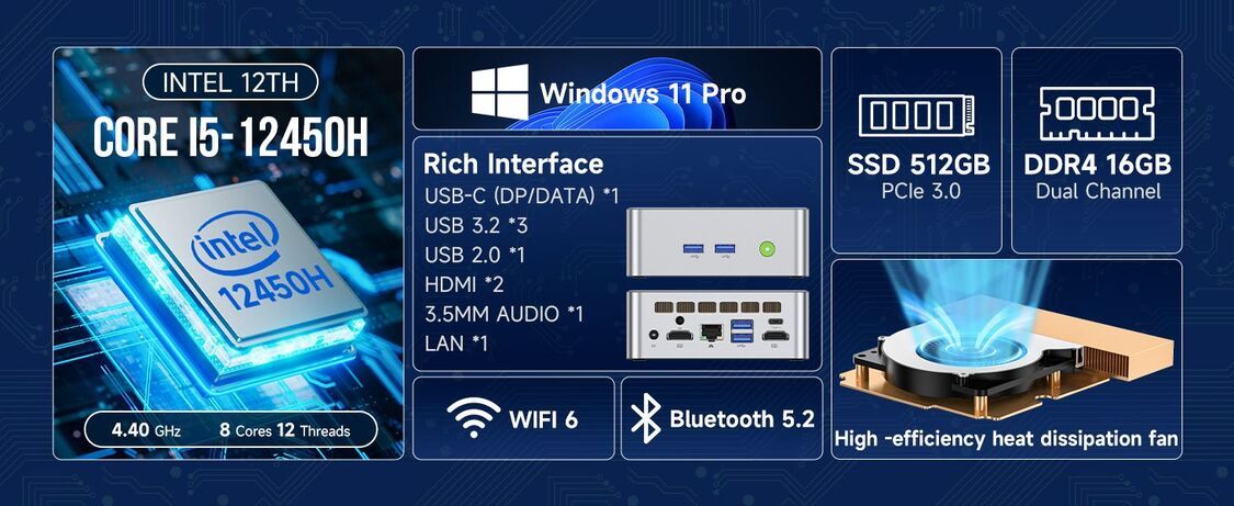 GMKtec-M3 迷你電腦, 16G + 512G, Intel i5-12450H, Windows 11 Pro 4K三螢幕顯示輸出Mini PC, WiFi6 + BT5.2
