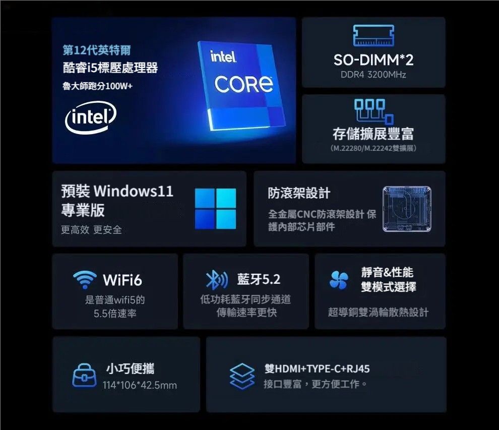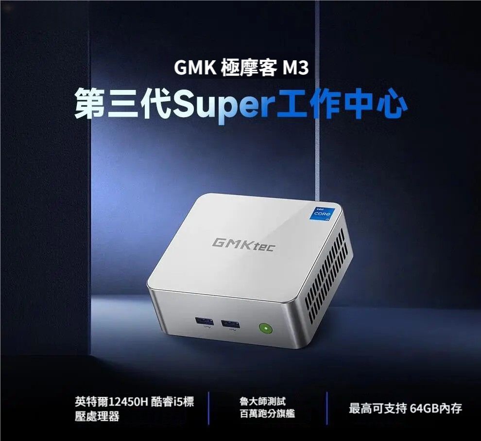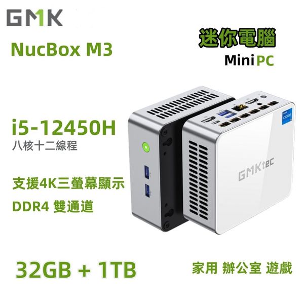 GMKtec-M3 迷你電腦, 32G + 1T, Intel i5-12450H, Windows 11 Pro 4K三螢幕顯示輸出Mini PC, WiFi6 + BT5.2