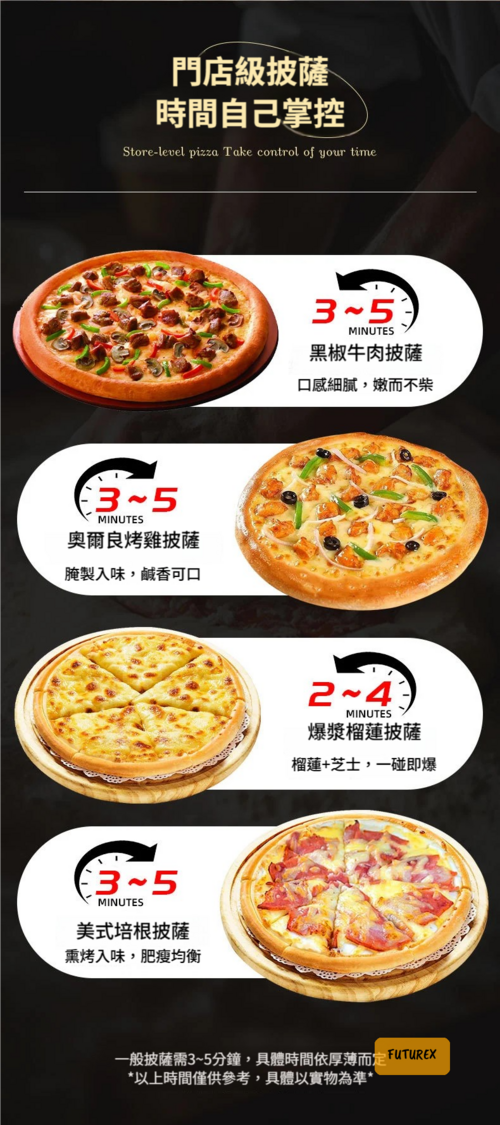 - 烹飪時間:每個披薩約3-5分鐘(視厚薄而定)