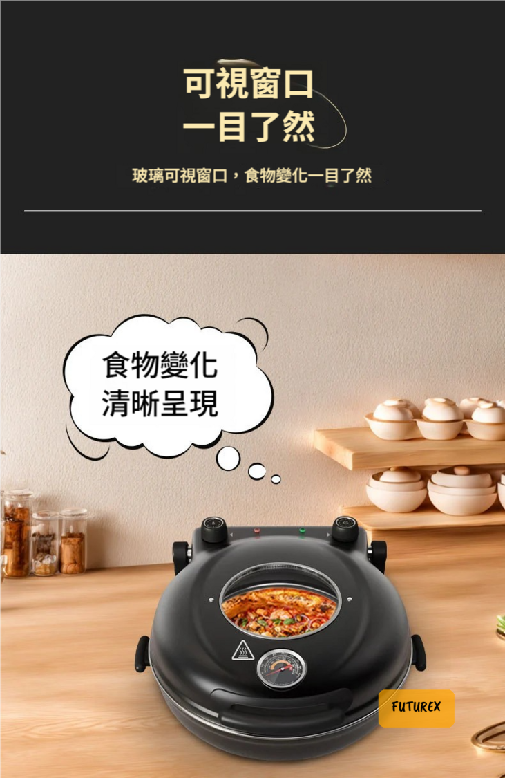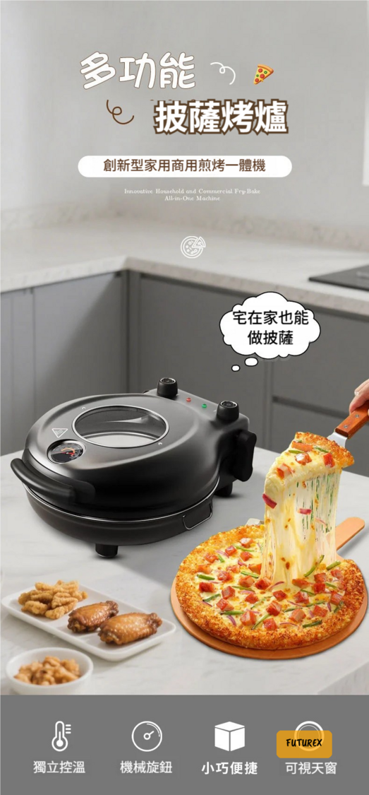 - 12吋黃金大容量:啱晒1-3人使用,無論係好友聚餐定暖心家宴,容量都足夠應付。可以整多款口味披薩,例如奧爾良雞肉、爆漿榴槤、海鮮玉米等,日日唔重複。