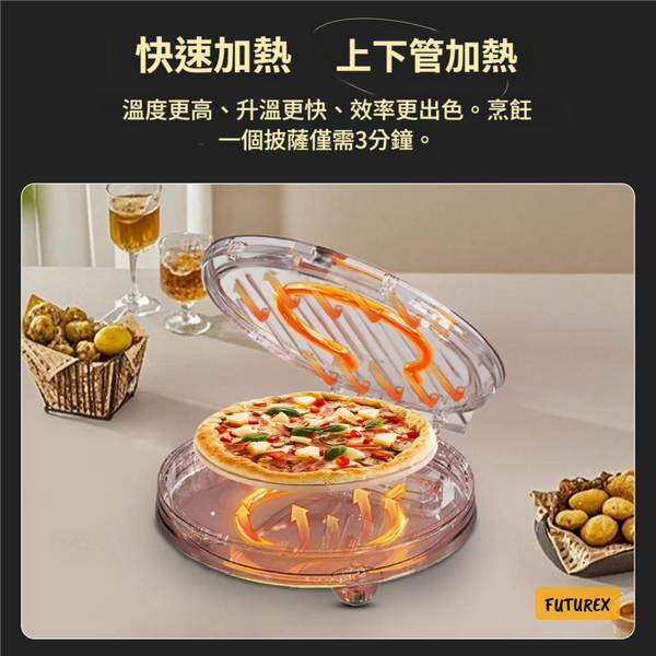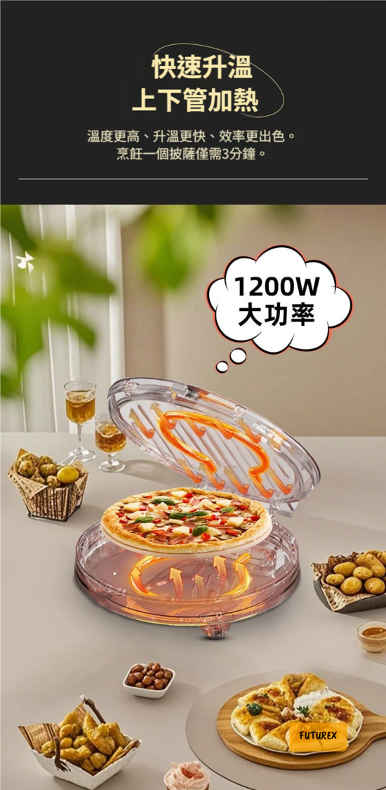 - 快速加熱高效能:1200W大功率配合上下管加熱,溫度更高、升溫更快,效率出眾。烹飪一個披薩僅需3分鐘,比普通焗爐快好多。