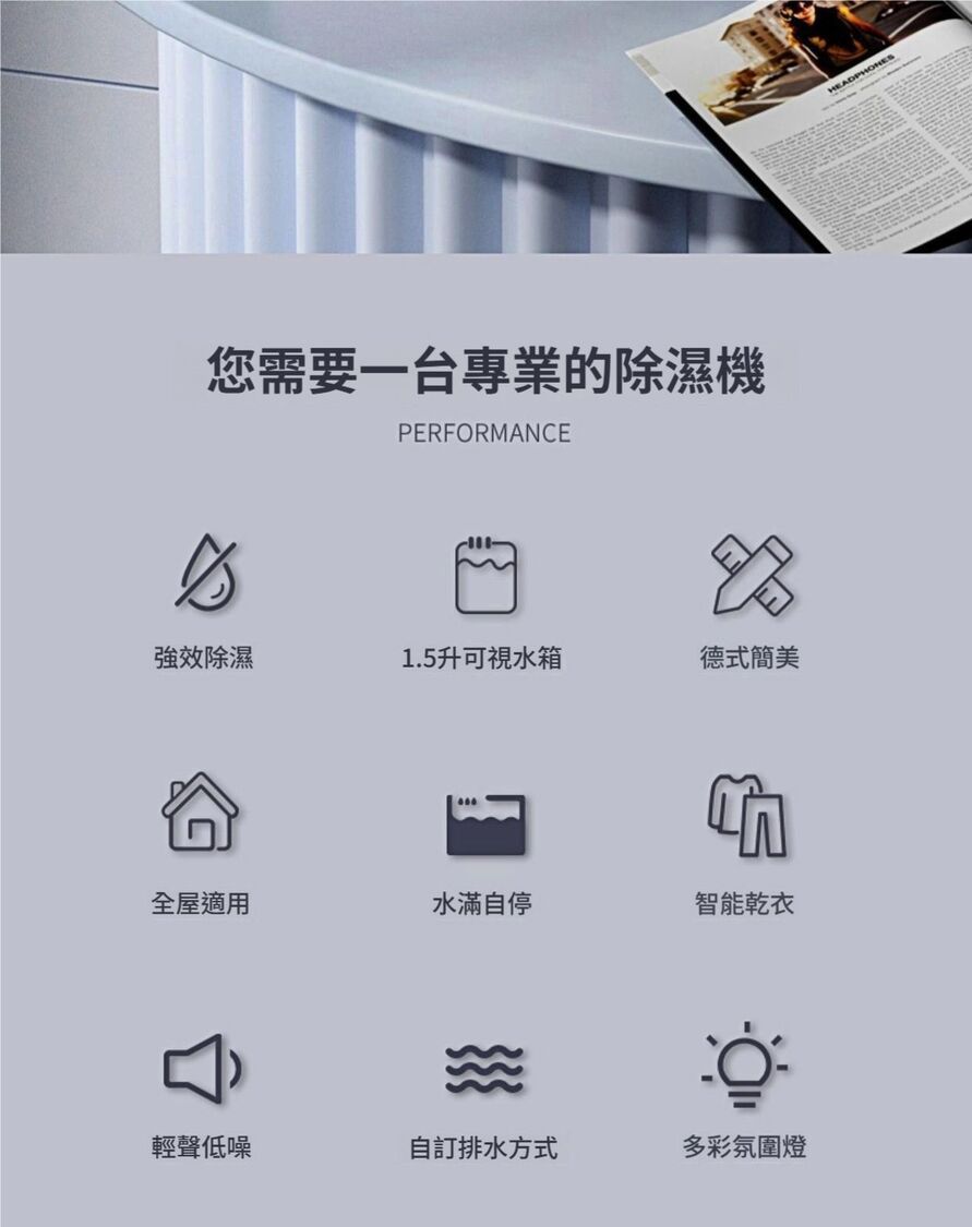 型號: H3-S 功率: 60W 除濕面積: 0-30 m² 水箱容量: 1.5L 電源:香港三腳插頭 產品尺寸: 181 x 123 x 269 mm 產品尺寸:181 x 123 x 269 mm 1.5L 水箱會滿時會滿水箱。 彩燈水箱:可視化水箱,搭載炫彩燈光系統 適用於30m²的房屋戶型,您可以逐間除濕