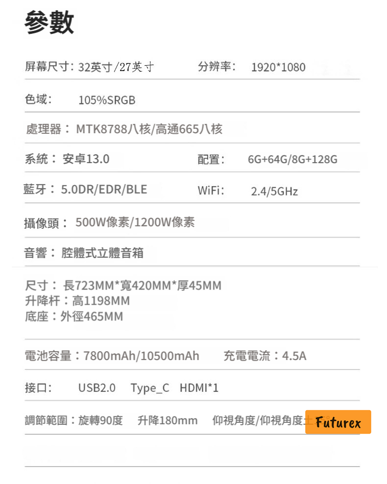 - Android 13系統,8GB RAM + 128GB儲存,運行流暢不卡頓