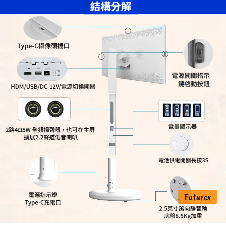 - 音響:2路40W全頻揚聲器 + 2.2聲道低音喇叭