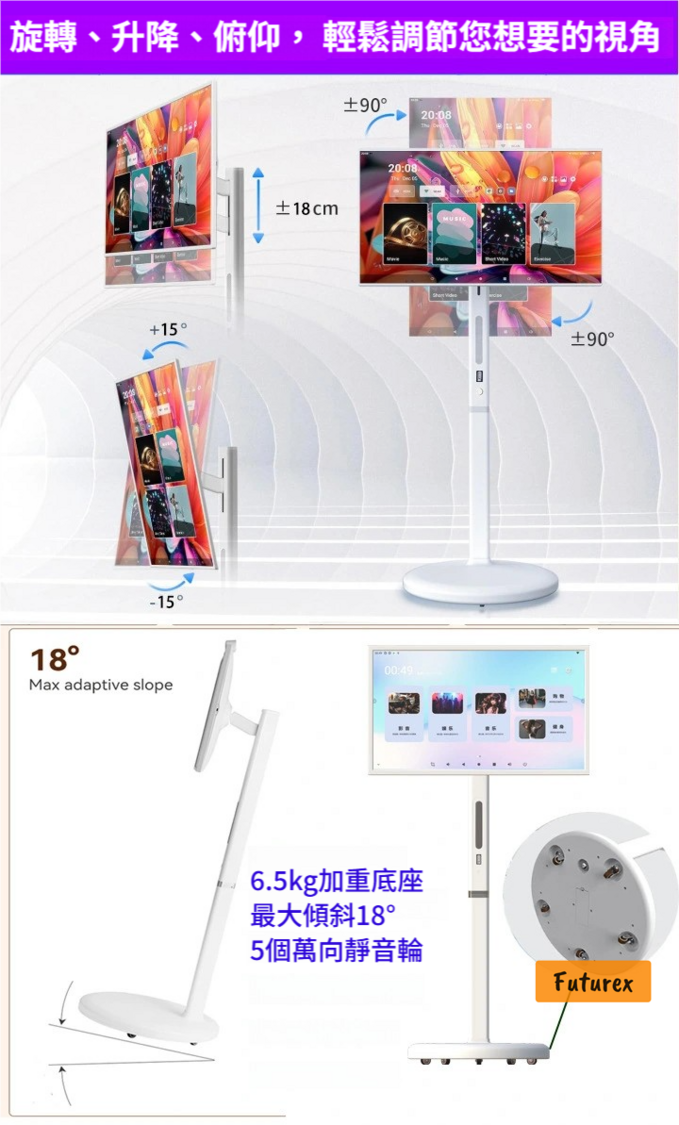 - 可升降(180mm)、旋轉(±90°)、俯仰(±15°)調節,三角支架更穩固