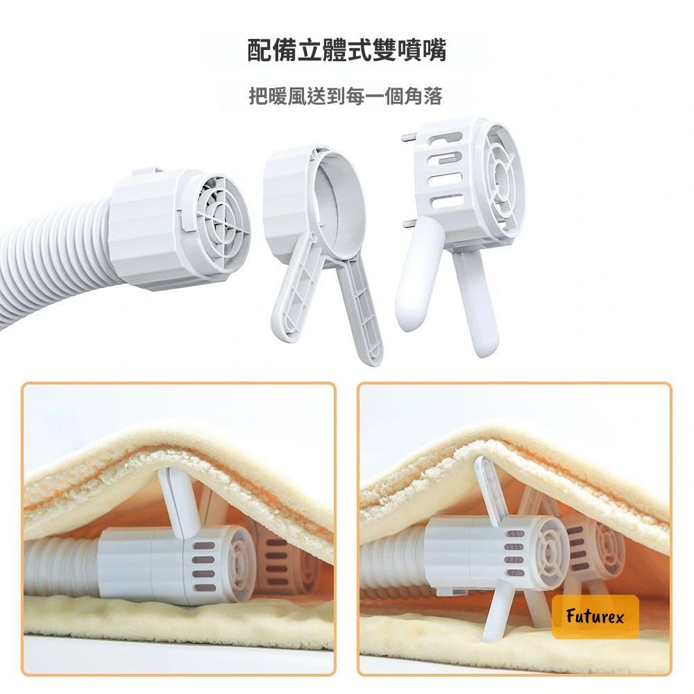 - 立體雙噴嘴設計,暖風直送被竇每個角落