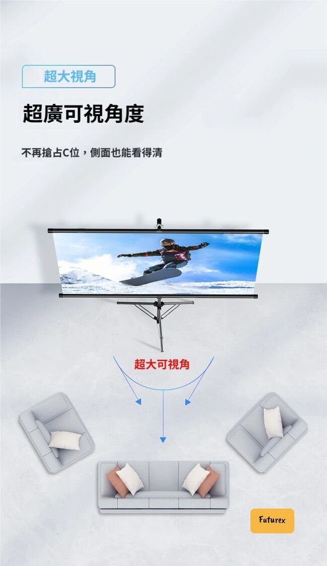 - 靈活兩用設計:落地支撐或免打孔壁掛,幕布可拆卸,慳位易收納,魚與熊掌兼得。