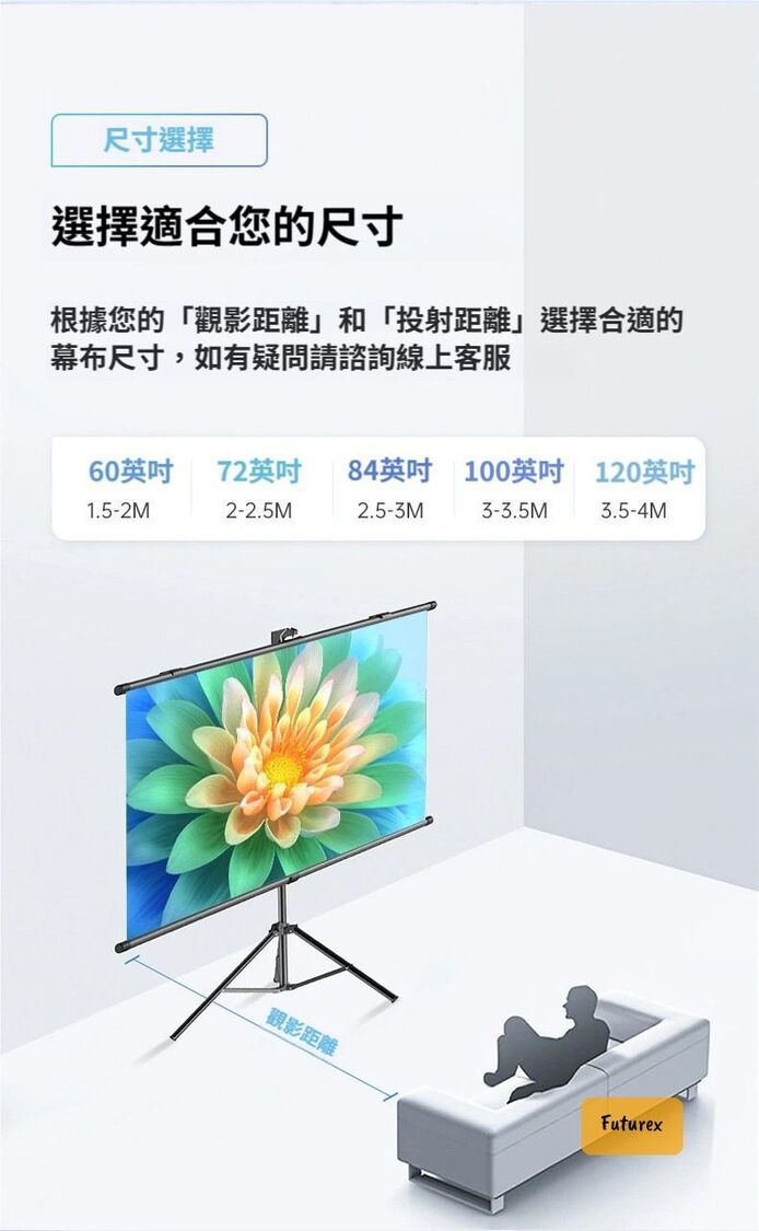 - 尺寸選擇:60吋、72吋、84吋、100吋、120吋