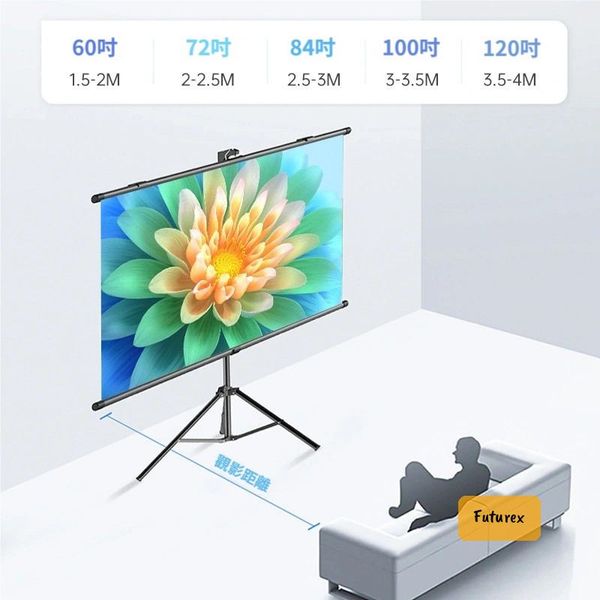 - 尺寸(長x高):60吋: 1.3m x 0.7m;72吋: 1.5m x 0.8m;84吋: 1.8m x 1.0m;100吋: 2.2m x 1.2m;120吋: 2.6m x 1.4m