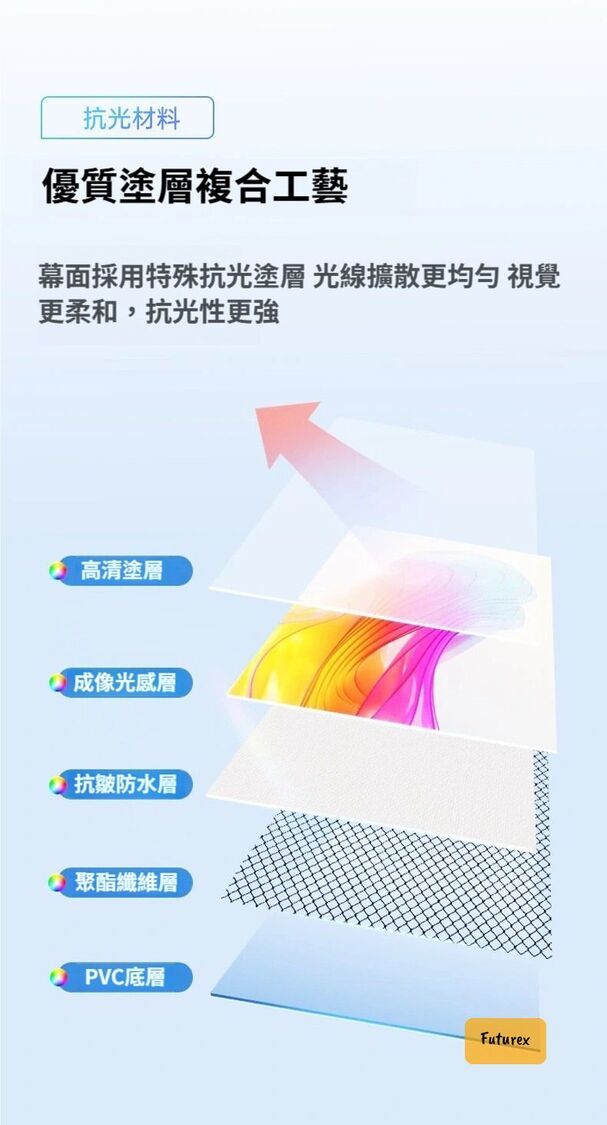 - 抗光增益幕布:採用特殊塗層,白天直投都無懼強光,畫質鮮豔明亮,視覺更柔和。