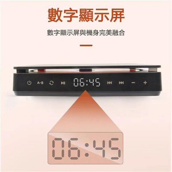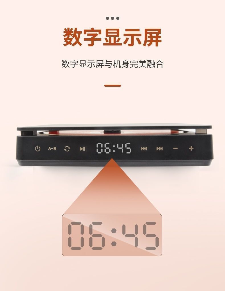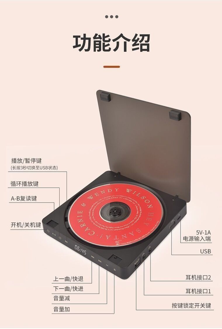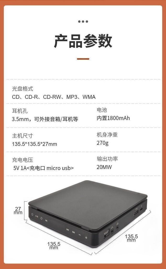 1.額定電壓:110v-240v 2.額定功率:5W 3.盤片放置方式:卡式 4.音頻線類別:音頻線 5.音箱介面:3.5MM音訊線接口 6.材質:ABS 7.可播放各種CD光碟,相容性強,讀取率高。 8.便攜式充電,續航力10小時。 9. 1800mAH大容量鋰電池。 10.支援雙耳機播放。 11.數字顯示,觸控操作。