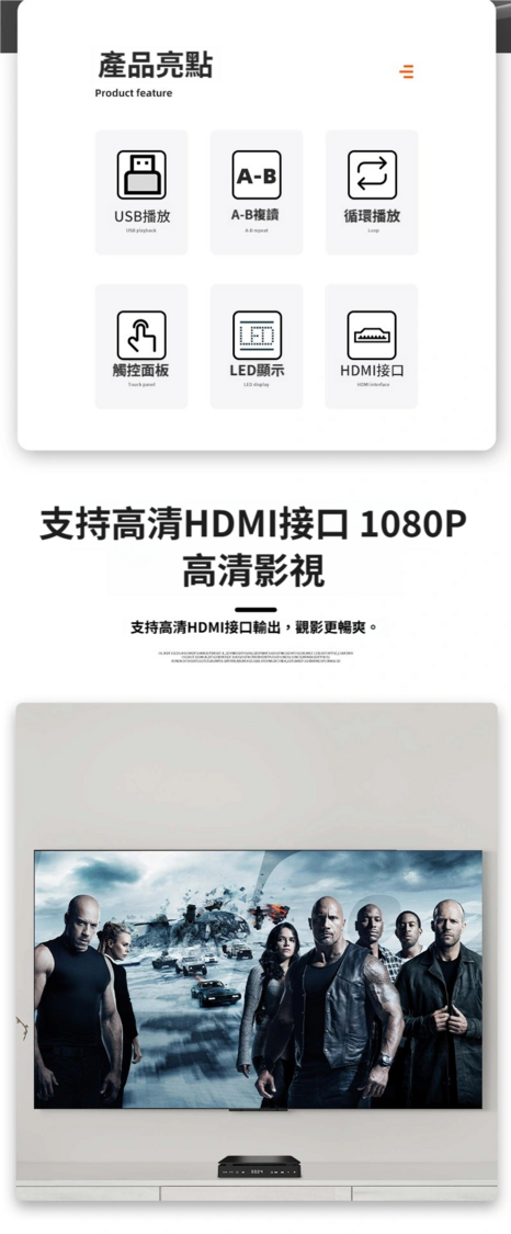 搭載1080P全高清解碼技術,透過HDMI線連接電視/投影機即時升級家庭影院!AV輸出兼容傳統電視,老人家都識用。數碼音頻接口可接駁環繞音響,臨場感爆燈!