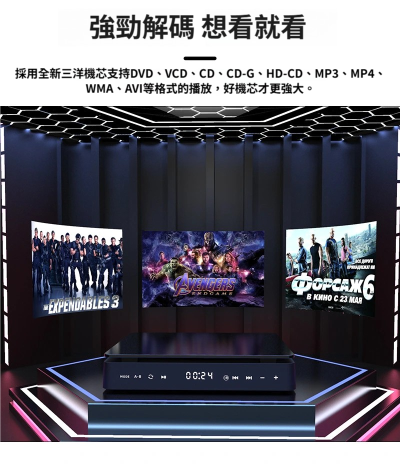 ▶ 支援格式:DVD/VCD/CD/MP3/WMA/AVI/MP4