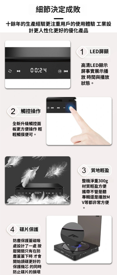 採用日本Sanyo抗震機芯,流暢讀取DVD/VCD/CD/HD-CD/CD-G等光碟,USB直插播放MP3音樂、MP4/AVI影片、JPEG相冊。特別加入智能糾錯功能,播老舊碟片都順暢~