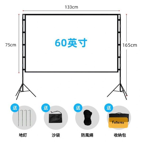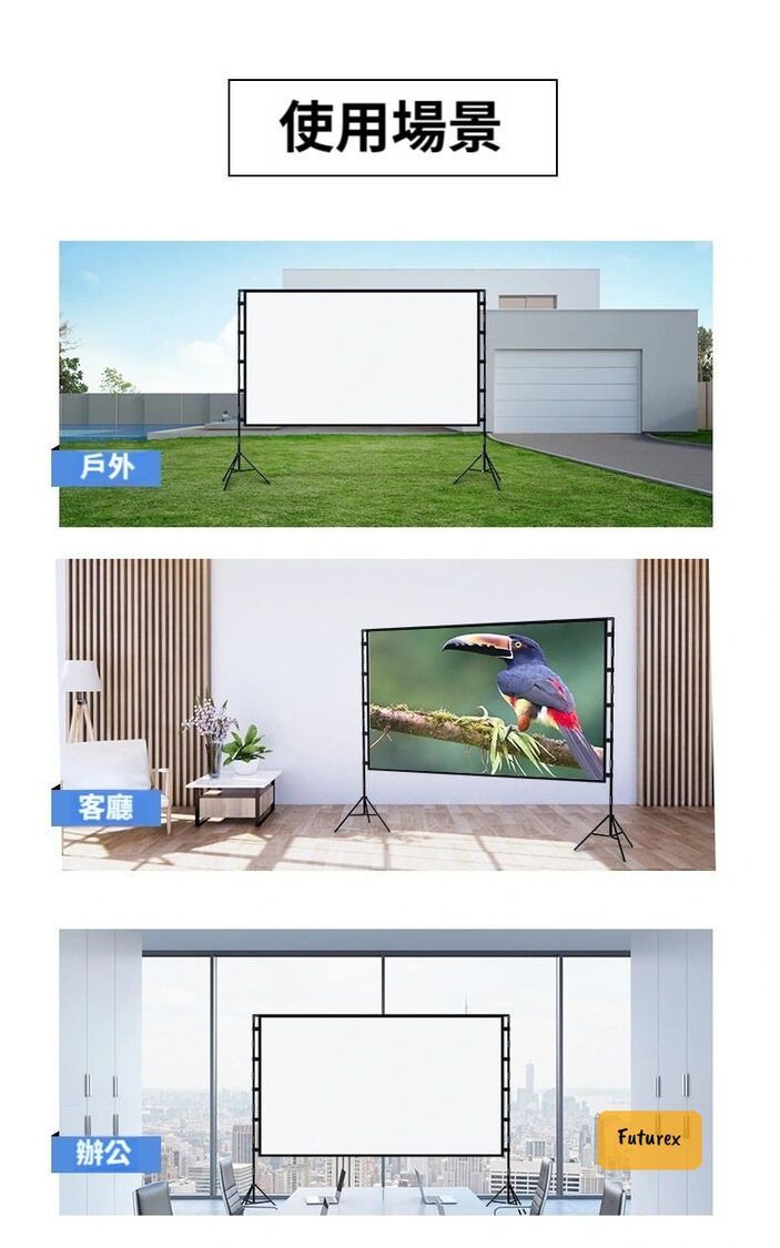 - 尺寸:60吋(133x75cm)、84吋(186x105cm)、100吋(221x125cm)、120吋(265x150cm)。