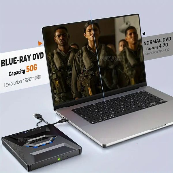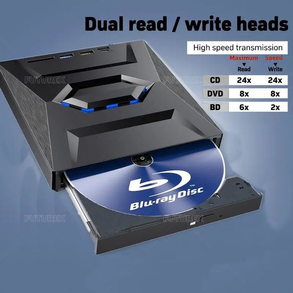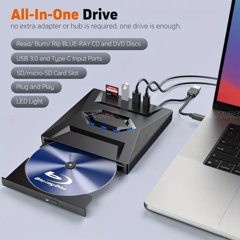 6 合 1 藍光光碟機:不僅是藍光 CD 和 DVD 讀取器,也是藍光 CD/DVD/藍光燒錄機、燒錄機、重寫機。多個連接埠集線器(2 個 USB 連接埠、1 個 Type-C 連接埠和 2 個 TF/SD 卡槽)