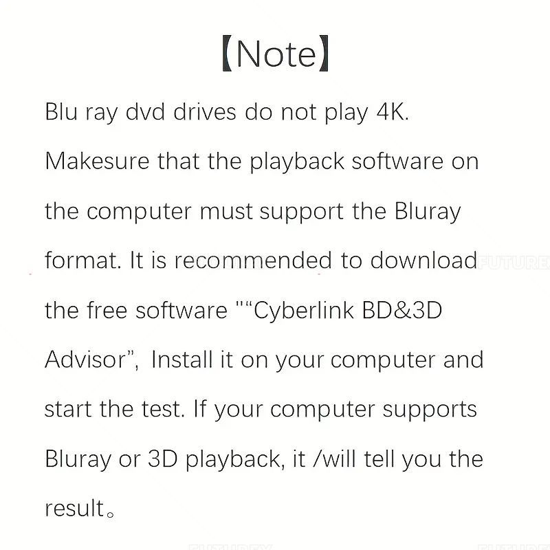 注意:藍光 DVD 光碟機無法播放 4K。確保電腦上的播放軟體必須支援 Bluray 格式。建議下載免費軟體「Cyberlink BD&3D Advisor」安裝在您的電腦上並開始測試。如果您的電腦支援 Bluray 或 3D 播放,它/將告訴您結果