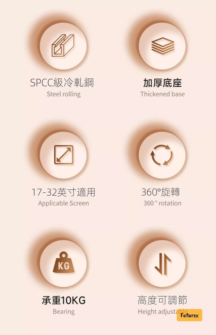 - 雙氣壓臂設計,升降順滑(1400mm調節範圍)