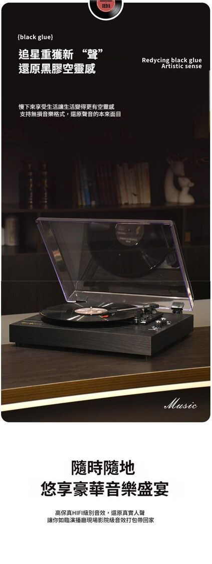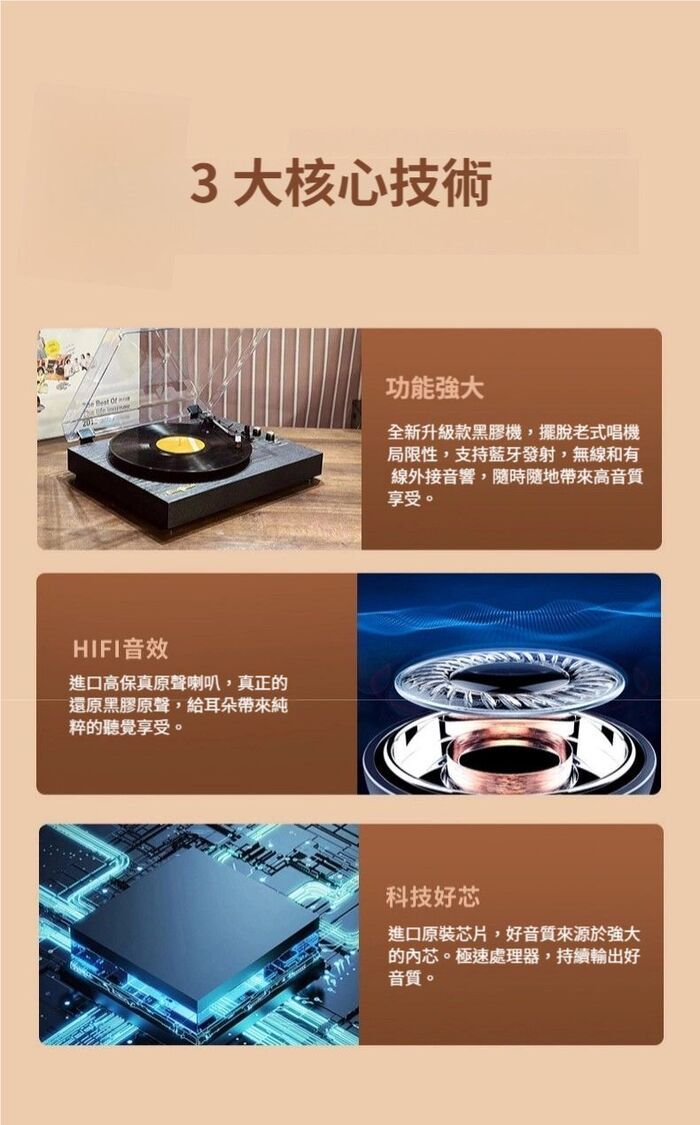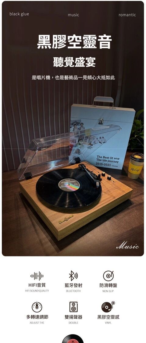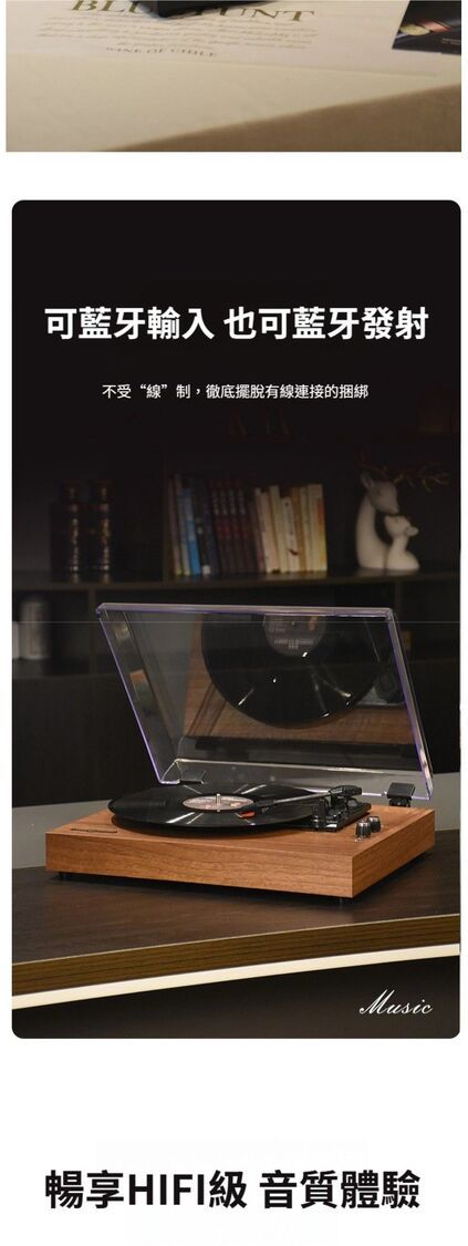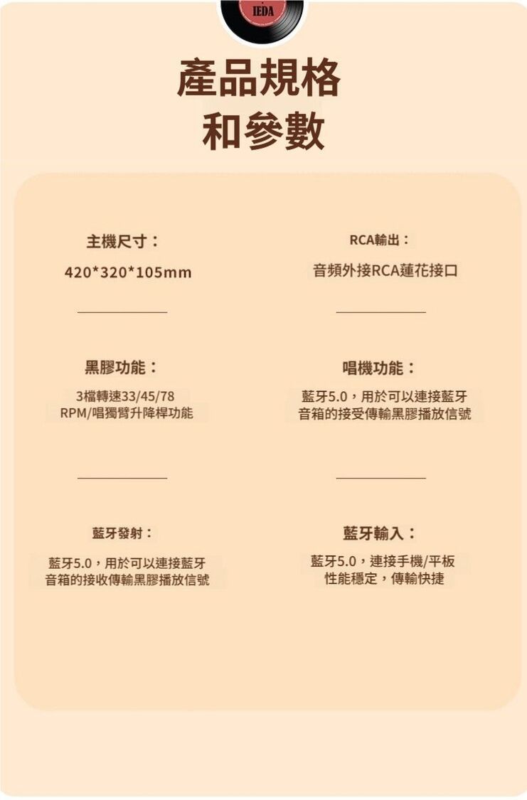 黑膠唱片機(支援33/45/78轉可調速) 機身尺寸:約420×320×150mm RCA輸出:音訊外接RCA蓮花介面 黑膠功能:3檔轉速33/45/78 RPM,唱臂升降功能 唱歌機功能:藍牙5.0,用於可連接藍牙的接受傳輸黑膠播放訊號 藍牙發射:可連接藍牙音響的接收傳輸黑膠播放訊號 藍牙輸入:連接手機/平板 電源供應器:香港三腳插頭