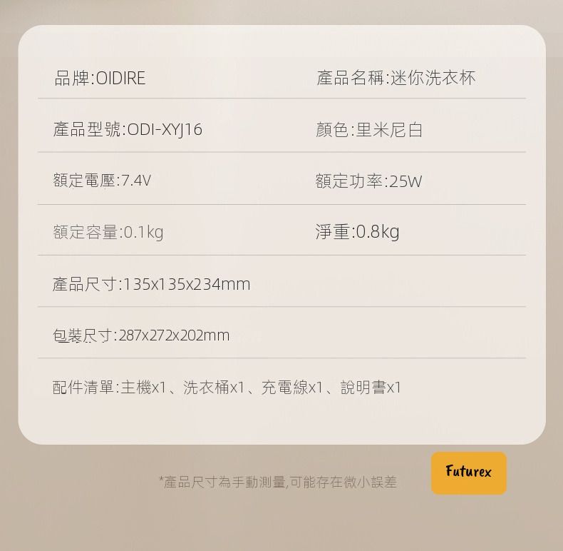 - 配件:洗衣桶x1、充電線x1、說明書