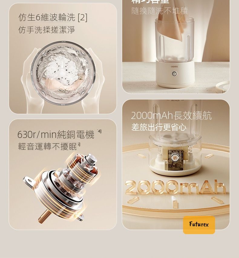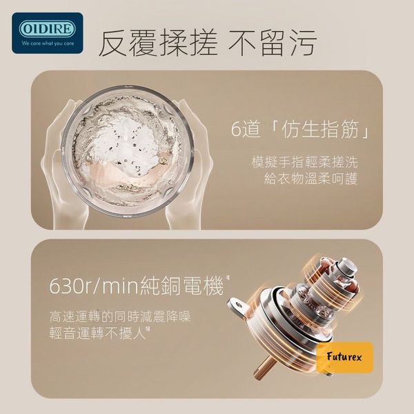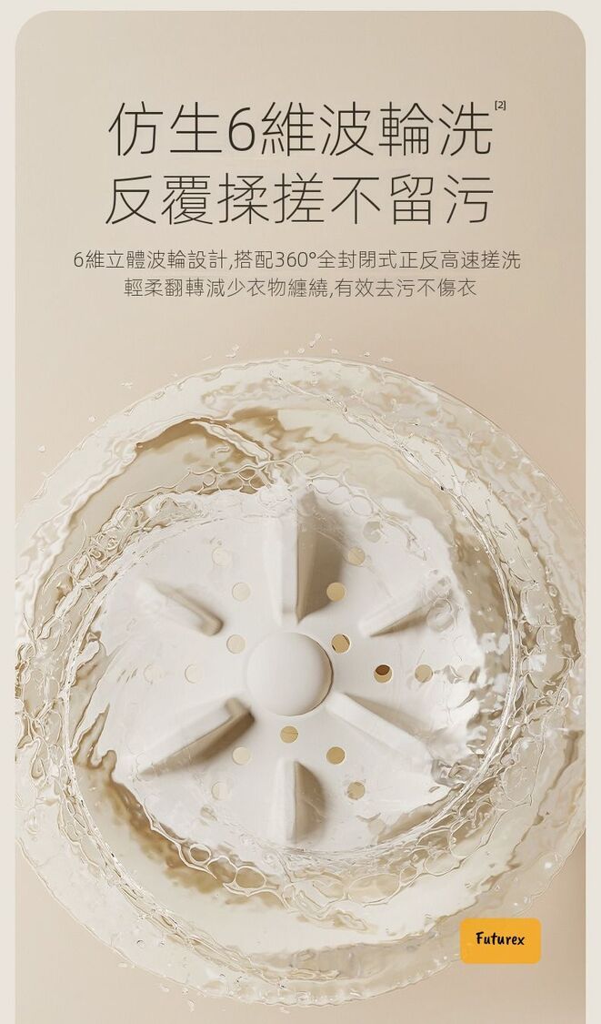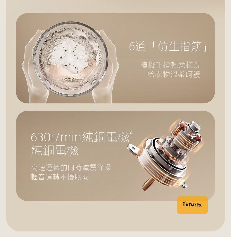 - 630轉純銅電機+6維波輪,仿人手搓洗