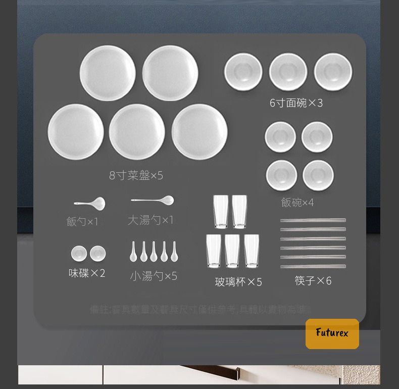 - 容量:8吋碟x5、碗x4、全套餐具