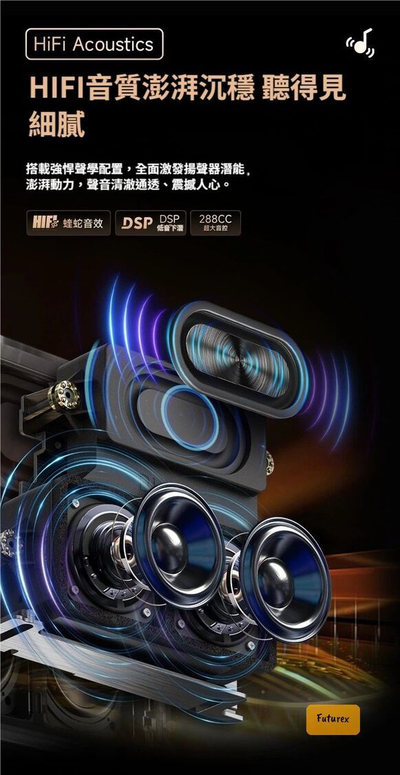 - HIFI音響系統,2個8W揚聲器+288CC超大音腔,低音震撼