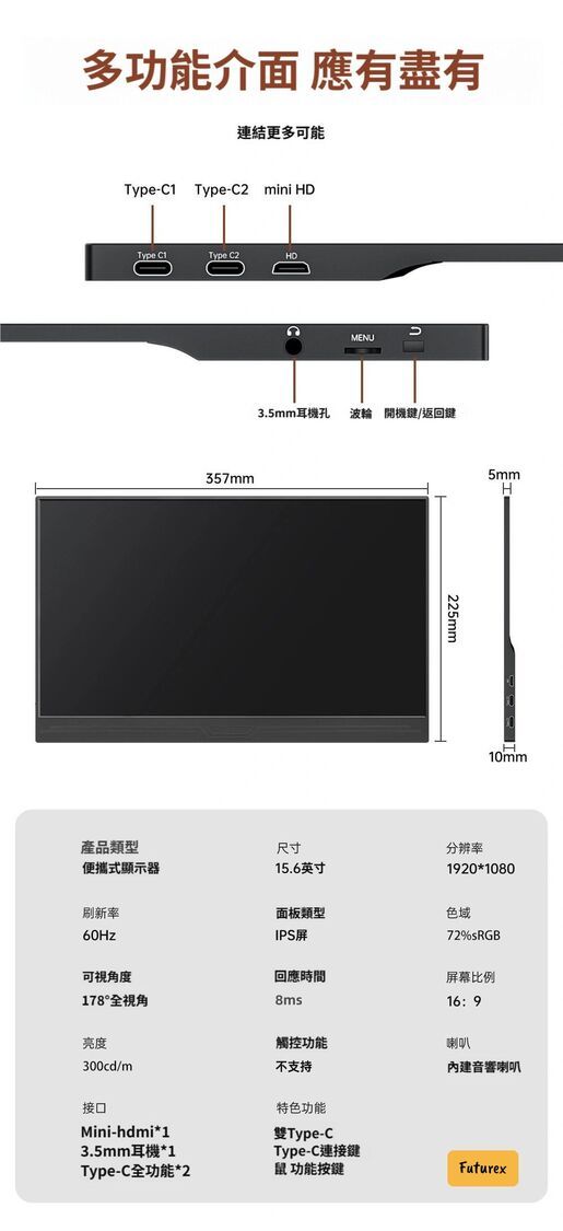 - 尺寸:15.6吋 | 解像度:1920×1080